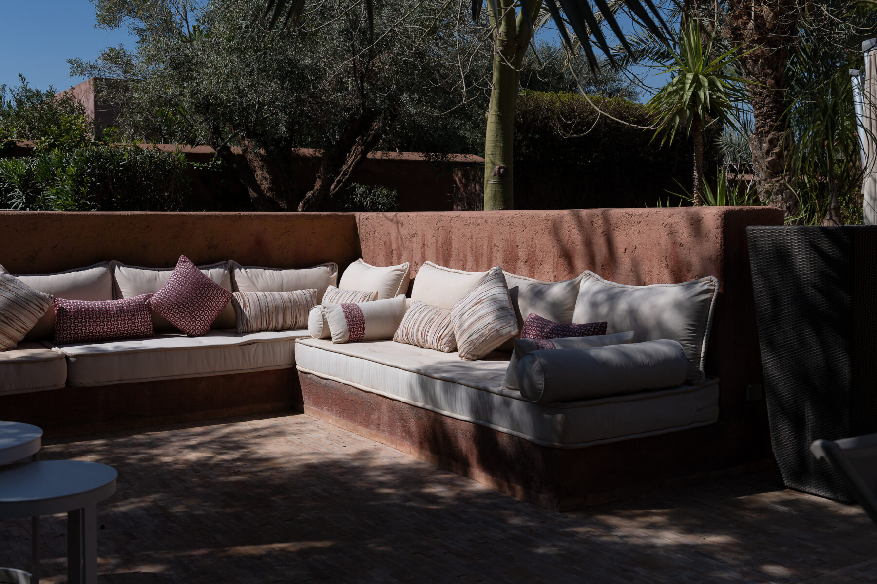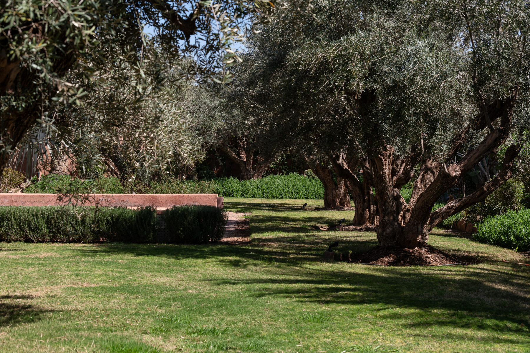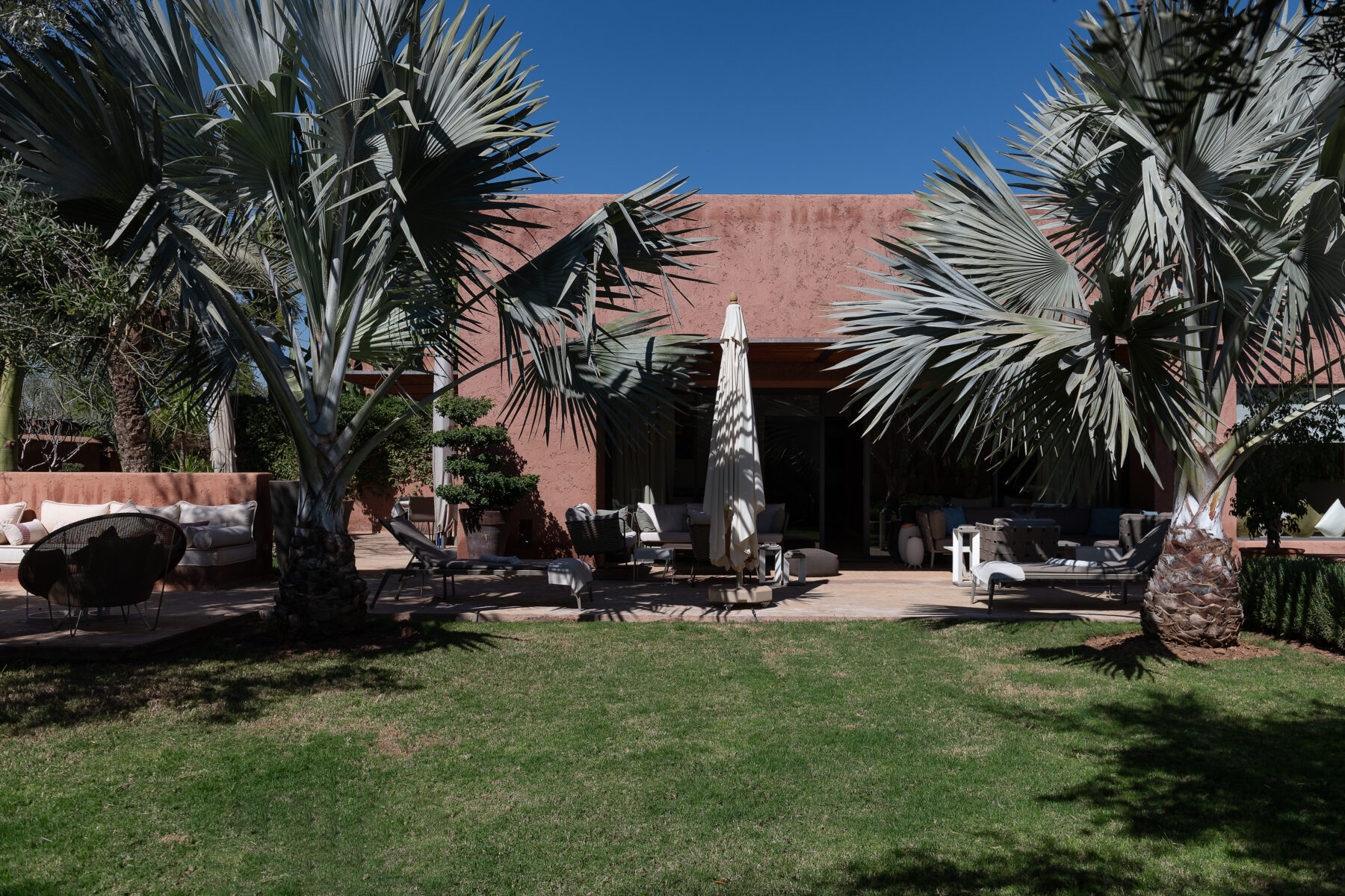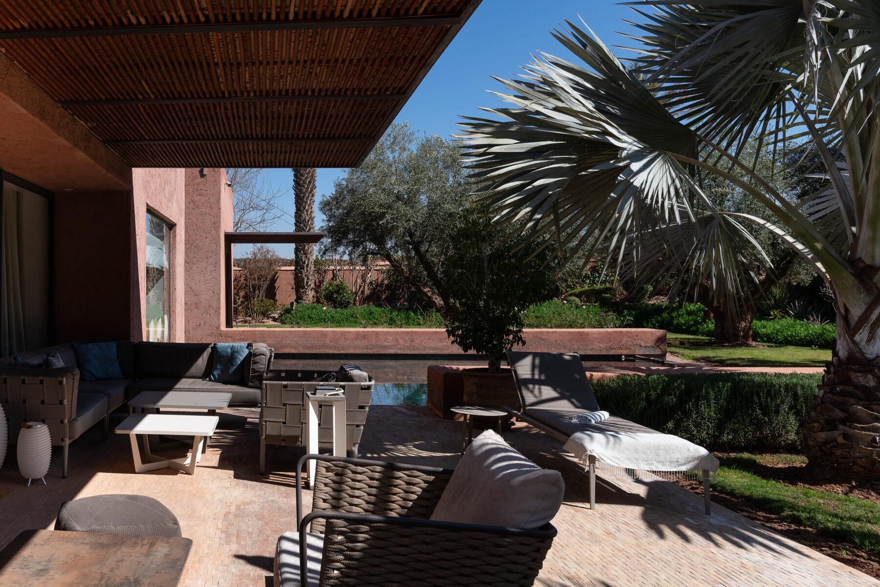 Villa Sawsan welcomes you to an incredible moment of relaxation. Nestled on the grounds of the famous Royal Palm golf course, directly adjoining the golf course, this villa is surrounded by hundreds of olive trees, rose bushes, orange trees and fragrant Mediterranean and African essences. The 2250 sqm (24220 sqft) grounds are a real garden of Eden of very soft curves, a beautiful combination of colours, foliage, shapes, textures and fragrances where you can rest and have a tea in one of the three garden seating areas.