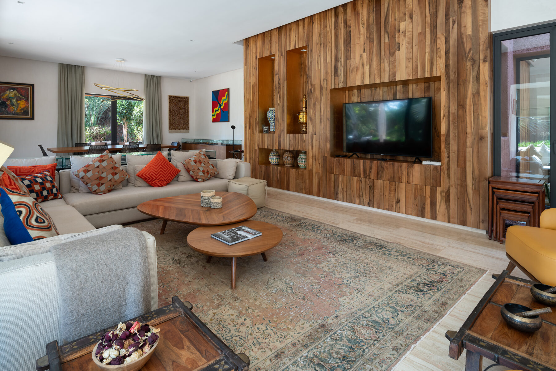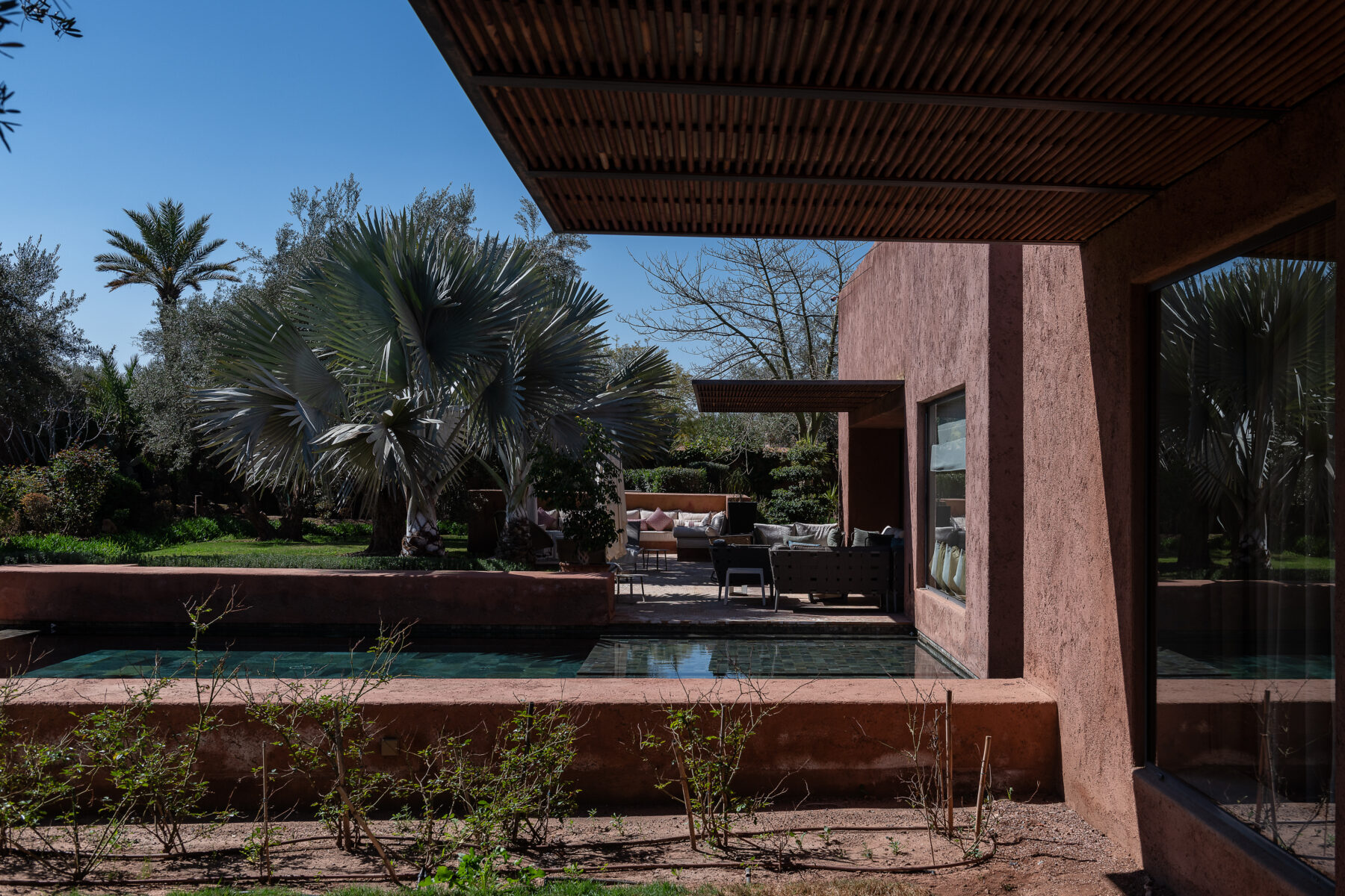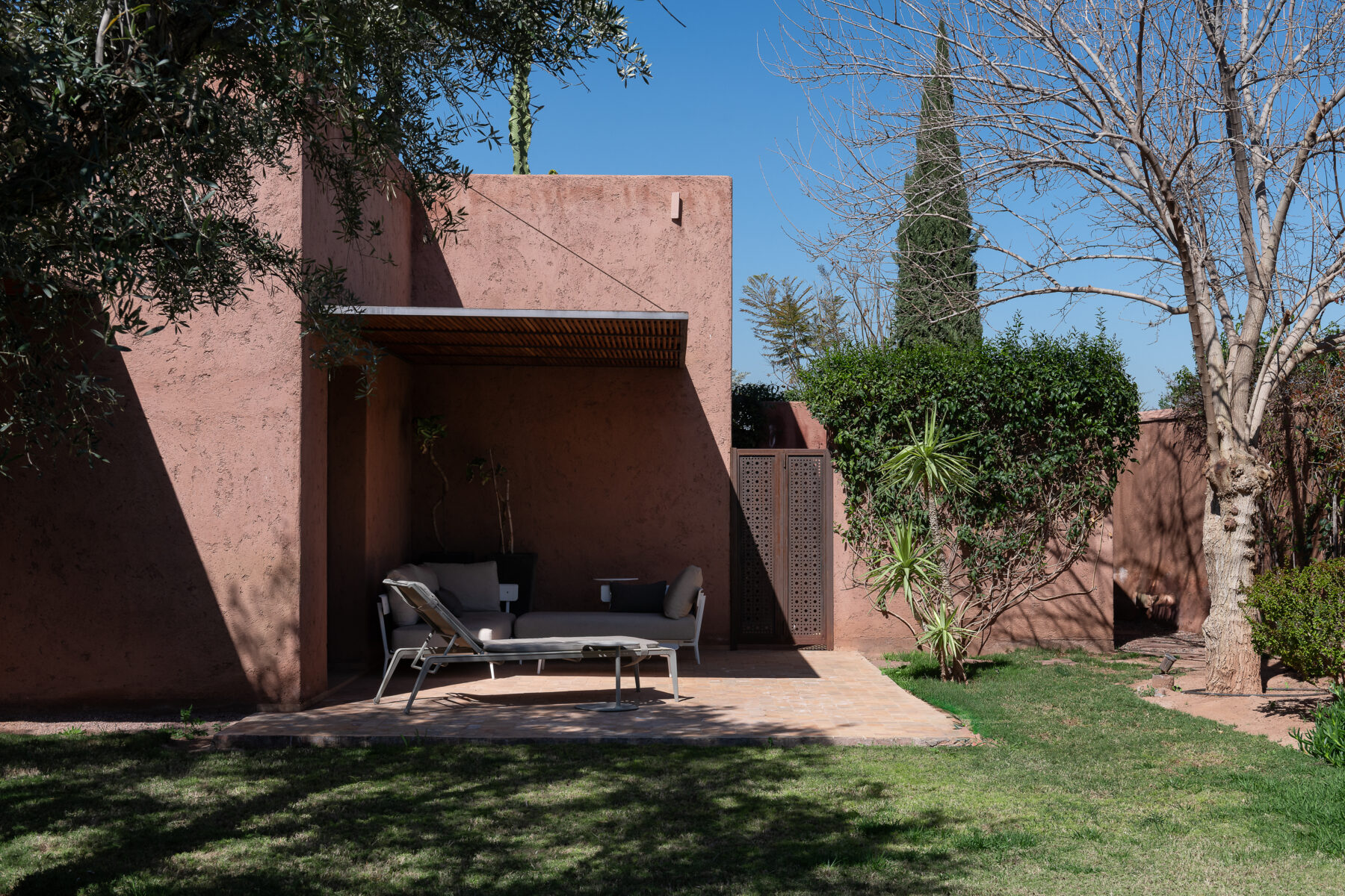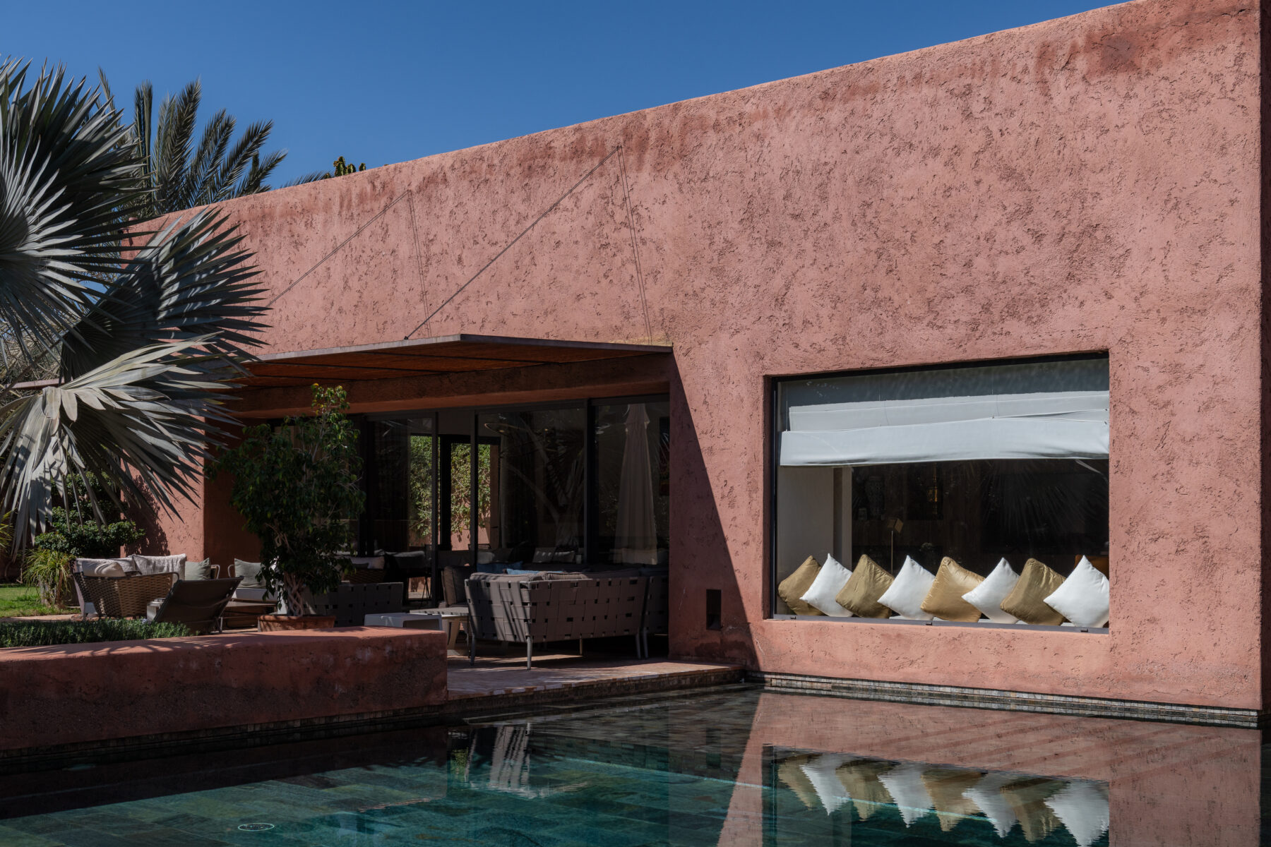 Villa Sawsan welcomes you to an incredible moment of relaxation. Nestled on the grounds of the famous Royal Palm golf course, directly adjoining the golf course, this villa is surrounded by hundreds of olive trees, rose bushes, orange trees and fragrant Mediterranean and African essences. The 2250 sqm (24220 sqft) grounds are a real garden of Eden of very soft curves, a beautiful combination of colours, foliage, shapes, textures and fragrances where you can rest and have a tea in one of the three garden seating areas.