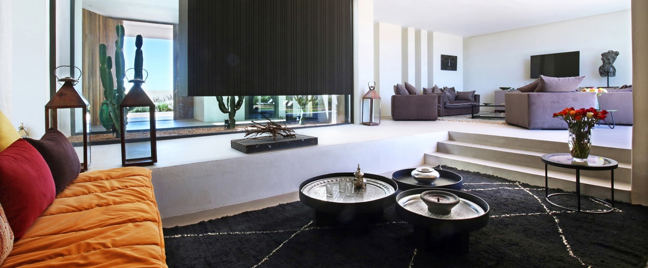 Les propriétaires ont fait intervenir un jeune architecte marocain amoureux des matériaux brut et des lignes pures, et un décorateur français implanté au Maroc depuis de nombreuses années qui détourne les objets traditionnels marocains pour les transformer en tableau, en tissus muraux, en mobilier et en sculpture.