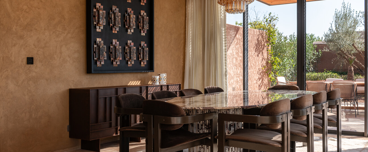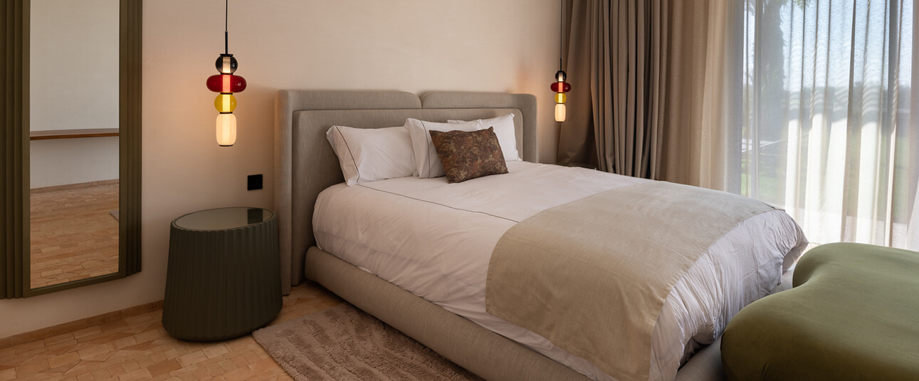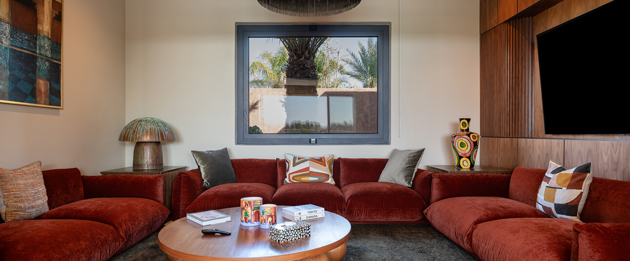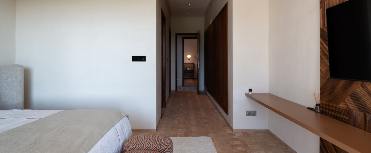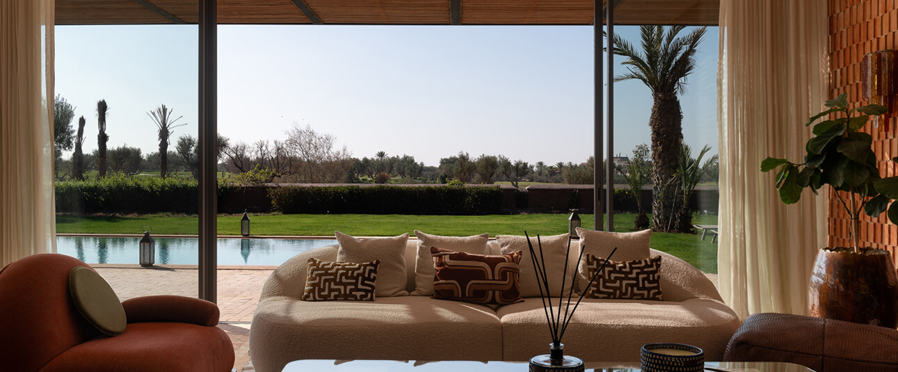 Nichée au cœur du prestigieux domaine Royal Palm, la villa IZURAN offre tout le confort d’un hôtel 5 étoiles dans une atmosphère chaleureuse, aux tons ocres inspirés des couleurs emblématiques de Marrakech. D’une superficie de 300 m² sur un terrain de 2000 m², elle marie avec élégance lignes contemporaines et finesse artisanale marocaine. Signée par le célèbre Studio KO, son architecture affirmée et son esthétique soignée en font une villa inspirante, digne des plus belles pages de décoration. Front golf, son jardin se prolonge naturellement sur le green, tandis que le soir, les palmiers illuminés prolongent la magie jusque sur le parcours, pour des nuits inoubliables en terrasse.